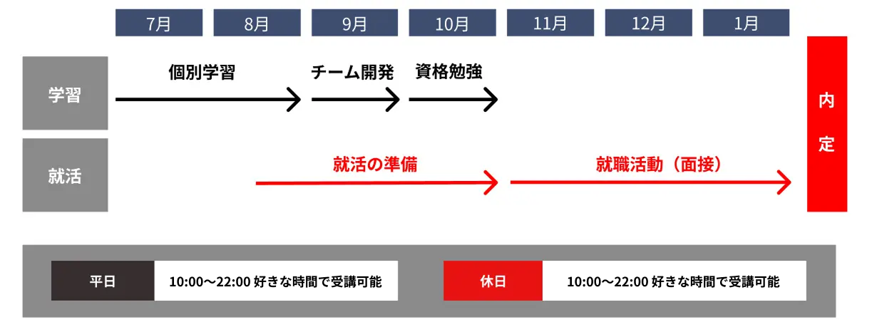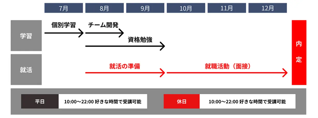 当スクールは、10:00~22:00 好きな時間で受講可能です。プログラミング専攻では3か月間(420時間)、 インフラ専攻では2か月間(280時間)をカリキュラムの学習期間としています。 カリキュラム以外で資格試験の勉強をされる方などは、学習期間内であれば、担当講師と相談のうえ対応を行っております。